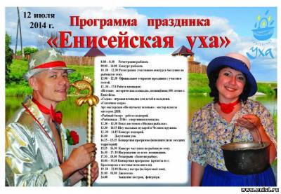 8.40 – 09.00 Доставка рыбаков к месту рыбалки. 09.00 – 14.00 Конкурс рыбаков. 09.00 – 11.00 Заезд участников подворий, размещение. с 10.00 Регистрация артистов с территорий, размещение (по мере пребывания). 10. 30 – 12.30 Регистрация участников конкурса частушек на рыбацкую тему. 11.50 Встреча гостей и сопровождение к месту открытия праздника. 12.00 – 12.30 Официальное открытие праздника с участием гостей. В финале – старт приготовления ухи! 12. 30 – 17.00 Работа площадок: «Истоки» - историческая площадка, посвящённая 400-летию г. Енисейска. «Садок» - игровая площадка для детей и молодежи: батут, аттракционы «Гигантские шашки», «Комната без стен», «Консервная башня», коворкингзона (мыловарение и изготовление леденцов), интерактивное кукольное представление. «Сказочное озеро» - персонажи сказок, связанные с водой. «Ручная рыбка» - творческая площадка по созданию рыбы с помощью детских ладошек. Арт-мастерская «По щучьему веленью» - мастер-классы мастеров ДПИ. «А я рыба, я рыба» - баннер с контуром рыбы (размер 1.5х3.0), на котором могут оставить свои автографы участники праздника, рожденные под знаком зодиака «Рыбы». «Рыбный базар» - работа подворий с рыбной продукцией. Участники подворий используют костюмы и название лавок, соответствующие тематике праздника. «Рыбакиада - 2014» - спортивная площадка. 12.30 – 13.30 Показ костюмов «Модная рыбалка». 13.30 – 14.15 Шоу мыльных пузырей и Человек-пружина. 12. 30 – 14.15 Конкурс подворий. 14.00 Дегустация ухи. 14.15 – 15.15 Концертная программа (исполнители из соседних территорий) 15.15 – 16.30 Конкурс частушек на рыбацкую тему. 16.30 – 17. 30 Награждение по всем номинациям. 17.30 – 18.00 Розыгрыш «Золотая рыбка». 18.00 – 19.30 Концертная программа (местные исполнители). 19. 30 – 21.00 Песни у костра (на береговой зоне две площадки). 21.00 – 01.00 Дискотека. 24.00 Зажжение костров, фейерверк.
